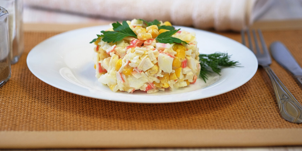 Olas nolobi un sagriez mazos gabaliņos. Krabju nūjiņas sagriez plānās šķēlītēs. Kukurūzu rūpīgi notecini.