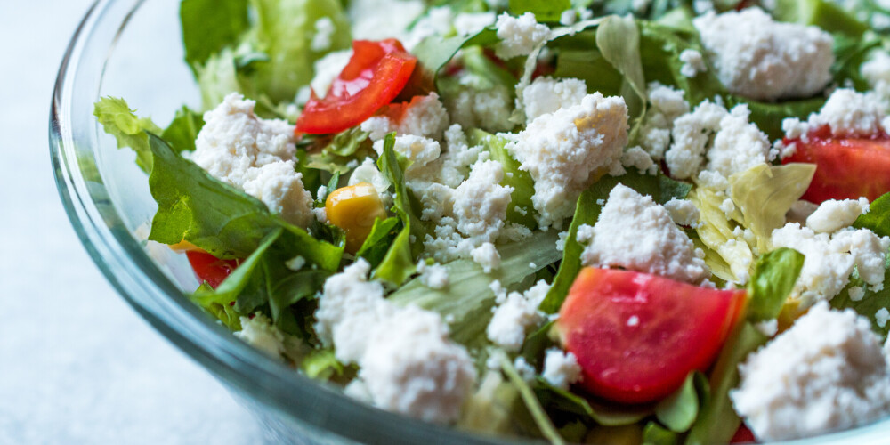 Bļodā samaisi tomātus un mārpuķītes ar mērci. Liec virsū siera biezpiena piciņas un pārkaisi ar riekstiem.