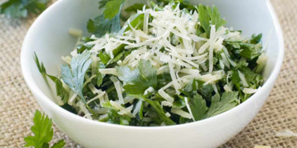 Īsi pirms pasniegšanas pētersīļu lapas smalki sakapā un sajauc ar rīvētu parmezānu. Pārlej ar eļļas maisījumu.
