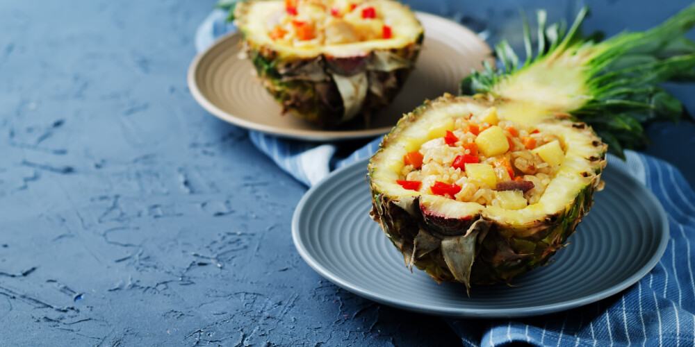 Lielā bļodā samaisi rīsus ar ananasiem, papriku, kukurūzu, sīpoliņiem un šķiņķi.