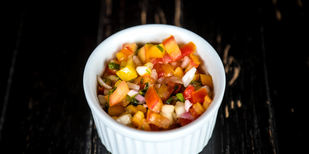 Dārzeņus un augļus, arī zaļos zirnīšu liec lielā bļodā, viegli pārkaisi ar sāli un cukuru un pārlej ar majonēzes mērci. Saudzīgi izcilā un pārkaisi ar zaļumiem.