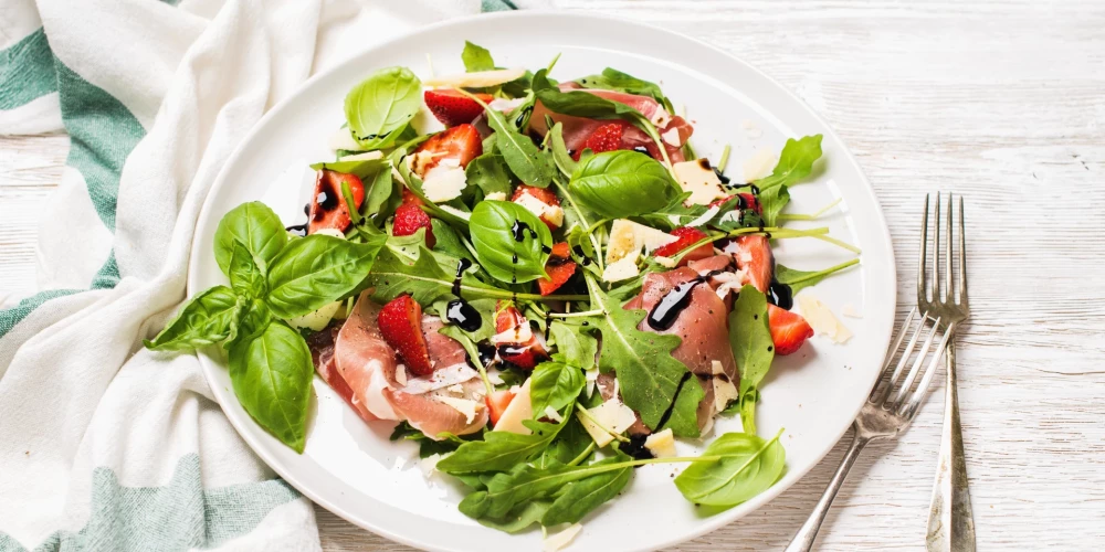 Zemenes ar baziliku liec uz liela šķīvja, kārto virsū šķiņķa šķēles un siera plēksnes.