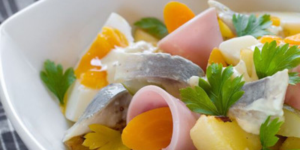 Kartupeļus, burkānus, olas, desu un siļķi sagriezt vienādos gabalos. Sīpolu smalki sakapāt. Krējumu sajaukt ar sinepēm un sīpoliem. Pēc garšas pievienot sāli un svaigi maltus piparus.