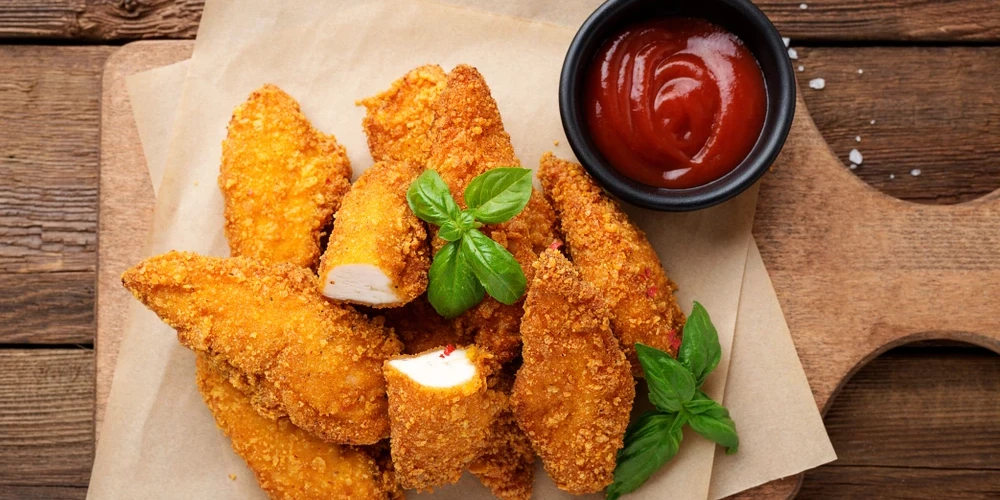Sagatavo trīs bļodas: vienā ieber miltus, nedaudz piparus, papriku, sāli un izmaisa, lai tie sajaucas. Otrā bļodā sakuļ olas. Trešajā ieber rīvmaizi.