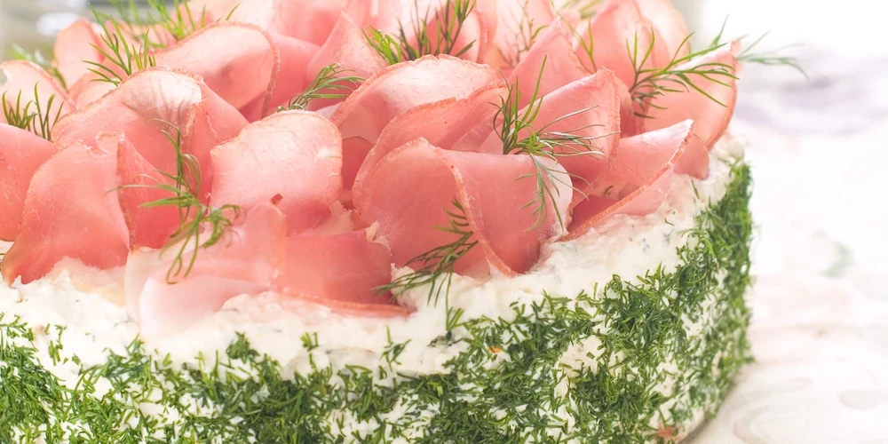 Noņem malas un apsmērē kūku no visām pusēm ar biezpiena masu. Augšu dekorē ar vītinātas cūkgaļas šķēlītēm veidojot rozītes. Malas apkaisa ar smalki sakapātām dillēm.