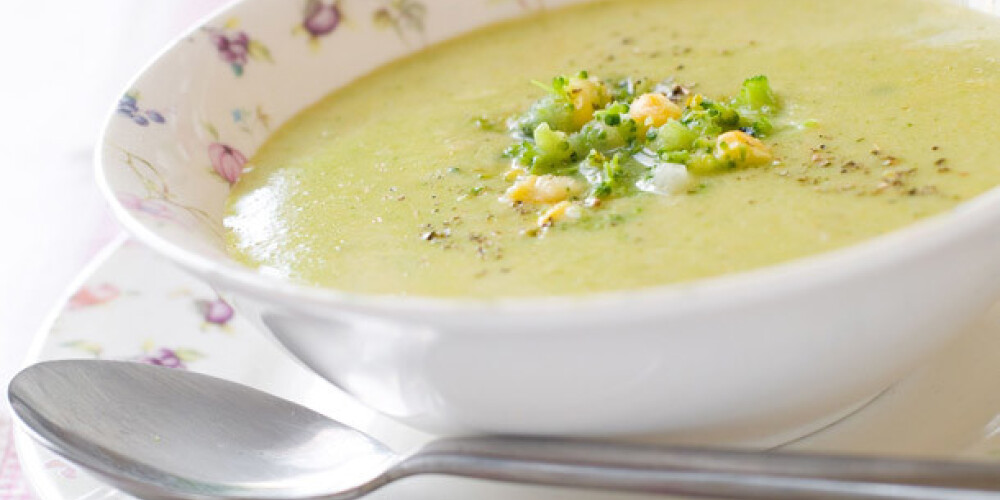 Masu pārlej katlā, pievieno dārzeņus un nepārtraukti maisot karsē 10-12 min. Zupa nedrīkst vārīties! Zupu mazliet atdzesē un sablendē. Pēc vēlmes atšķaida ar vistas buljonu vai ūdeni.