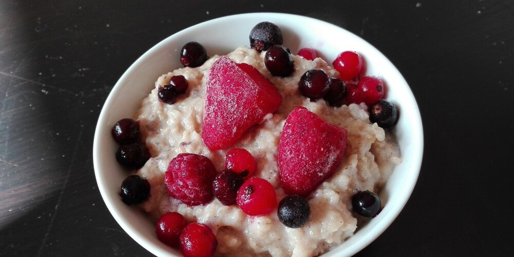 Tad pie­vie­no ro­zī­nes, ka­nē­li, val­riek­stus, ja vē­las arī pie­nu vai sal­do krē­ju­mu, sī­ru­pu vai me­du, iz­mai­sa, no­ņem no uguns un 5 mi­nū­tes zem vā­ka ļauj put­rai uz­briest un piln­vei­do­ties.