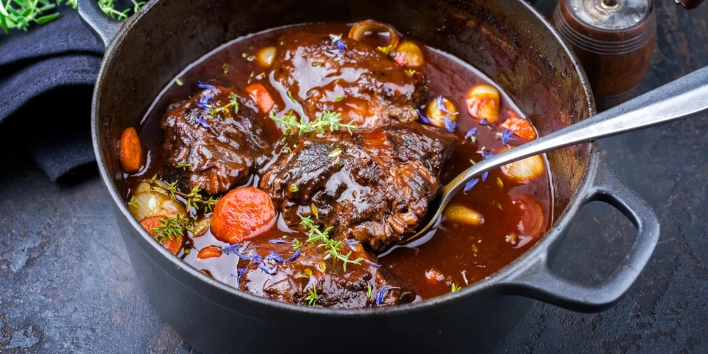 Uzkarsē cepeškrāsni līdz 150 grādiem. Sagriez gaļu 2x2 cm kubiņos. Liec to un garšvielas karstumizturīgā traukā ar vāku, labi samaisi, pārlej ar vīnu. Zem vāka tam ļauj sutināties 3,5 stundas, līdz gaļa gandrīz kā izšķīdusi.