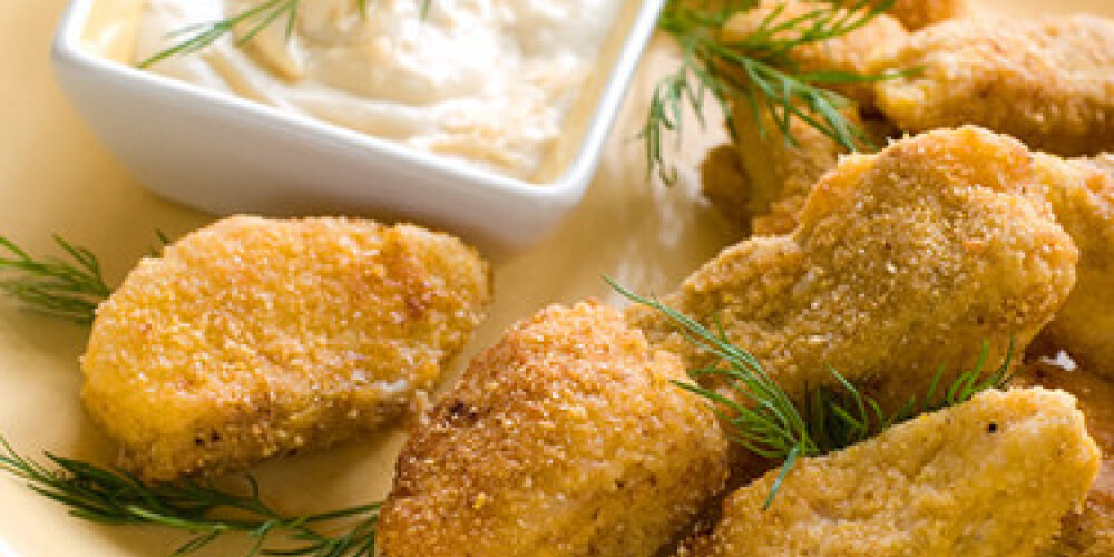 Zivju filejas pirkstiņus pasniedz ar krējuma mērci.