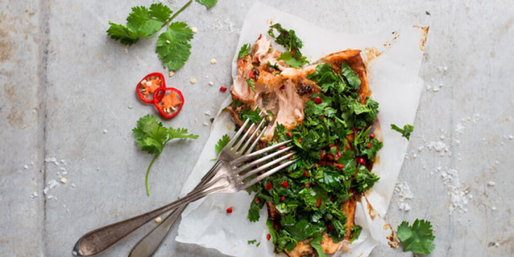 Kinzu smalki sakapāt. Čili piparu sagriezt uz pusēm, iztīrīt sēklas un sagriezt mazos kubiņos. Tāpat sagriezt ķiploka daiviņu. Kinzu sajaukt ar čili pipariem, ķiplokiem un laima sulu.