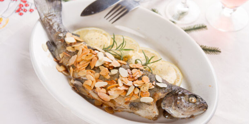 Zivis kārto un sasildīta šķīvja, apkaisa ar apgrauzdētām mandelēm, dekorē ar apelsīnu sviestu un citrona škēlēm.