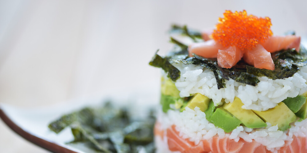 Tortes veidnē ar noņemamu malu liec kārtās pusi laša gabaliņu, pēc tam – rīsus, avokado, krēmsieru un atlikušo lasi.