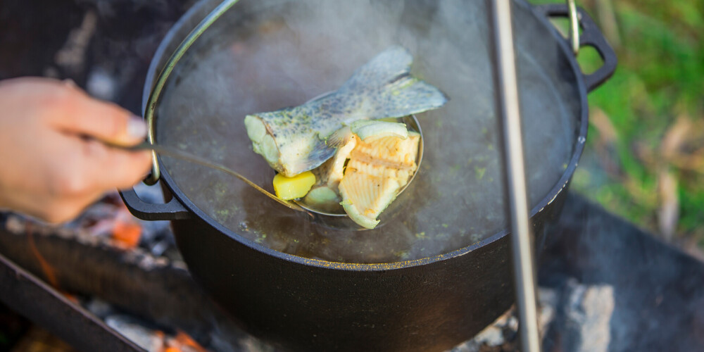 Tad pievieno lauru lapas un piparus, kartupeļus un palielos gabalos (4–5 cm) sagrieztas zivis. Uz mērenas uguns vāri kādas 15 minūtes.