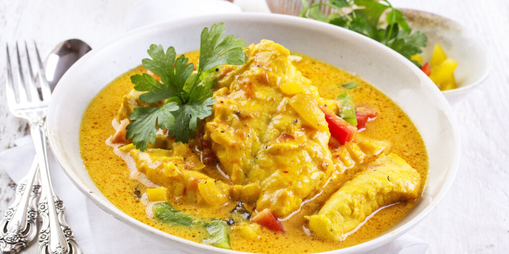 Pievieno cukuru un kariju, pielej buljonu un atlikušo citrona sulu, pieber sāli un piparus.
