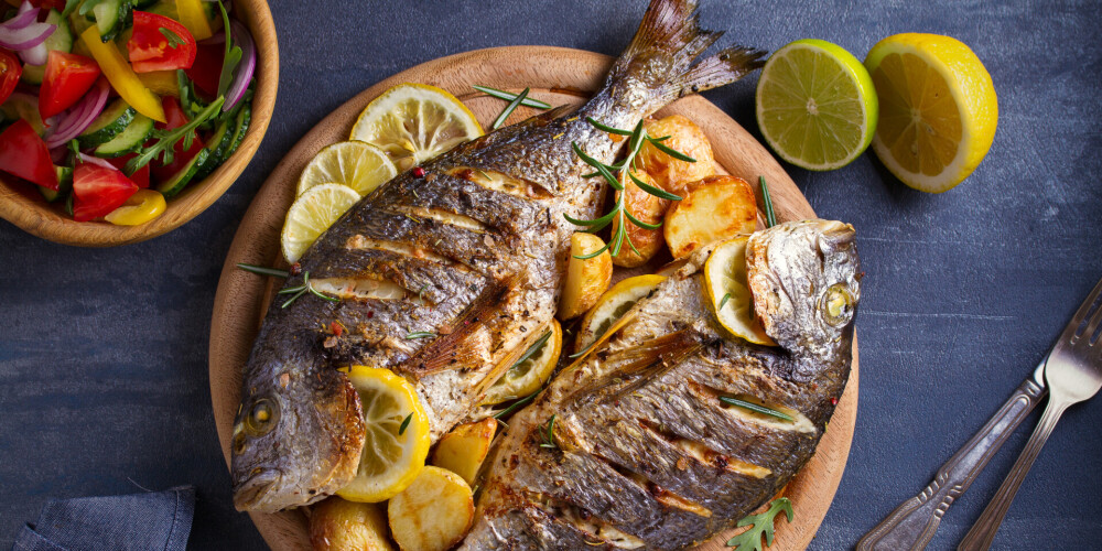 Uz dārzeņiem uzliec zivis, uz zivīm – citrona šķēlītes. Apslaki ar atlikušo eļļu. Cep krāsnī 20–25 minūtes.