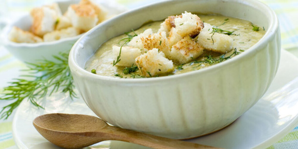Zupu pasniedz karstu, pārkaisot ar maizes grauzdiņiem.