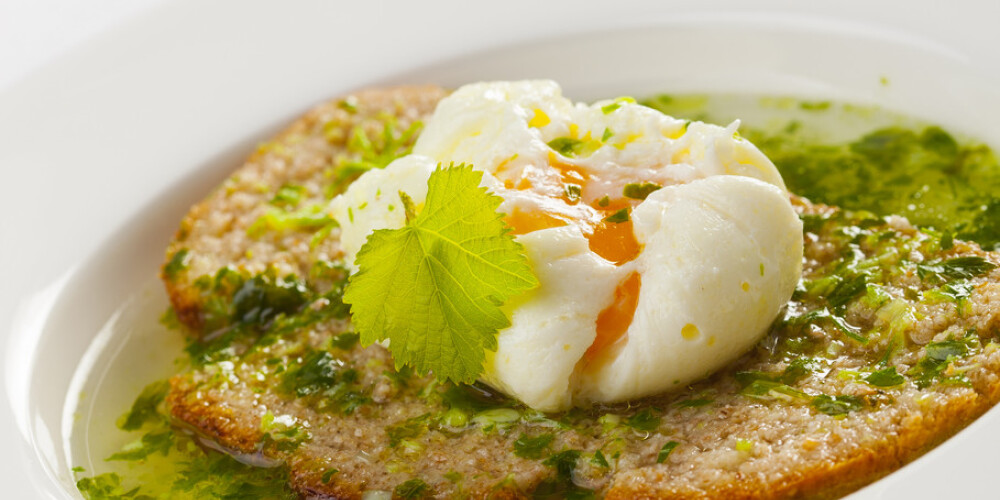Otrā katlā uzvāri 1 l ūdens un pielej etiķi. Uzmanīgi iesit pa 1 olai tā, lai neizšķīst. Kad baltums sarecējis, bet dzeltenums vēl nedaudz mīksts, saudzīgi izcel laukā.