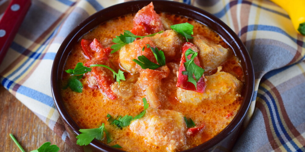 Pievieno tomātus, vistu kājas, piparu graudus un visu pārlej ar buljonu. Vāri, līdz gaļa gandrīz mīksta.