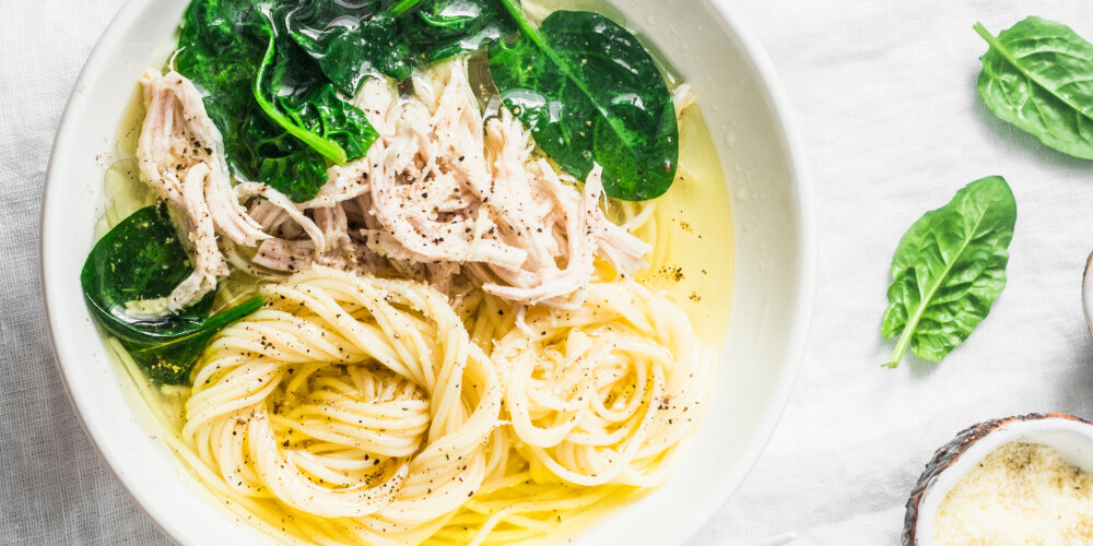 Pievieno sagrieztās vistas filejas un turpini vārīt vēl 4-5 minūtes. Noņem no uguns, ieber iekšā spinātus, sāli un piparus.