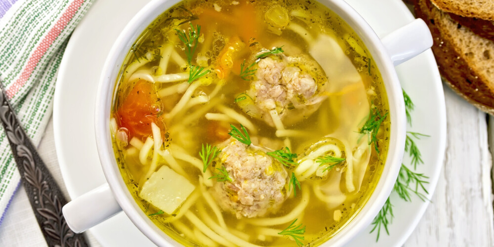 Katlā ar buljonu ieber pupiņas un izvāri gatavas. Pievieno frikadeles, pēc 10 minūtēm – nūdeles. Uzvāri un turpini vārīt 5 minūtes.