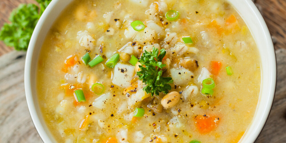 Pielej buljonu un uz lēnas uguns vāri aptuveni 20 minūtes. Trešdaļu zupas izsmel no katla, bet pārējo sablendē.