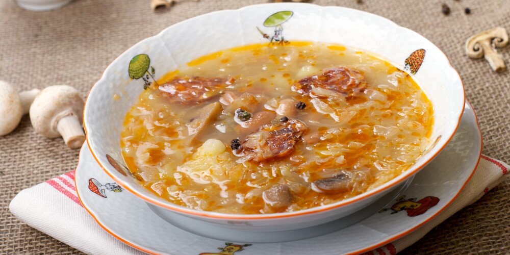 Sēnes pievieno buljonam un uzvāri. Pieliec kāpostus un vāri kādas 5 minūtes. Pieber kartupeļus un vāri vēl 5 minūtes.