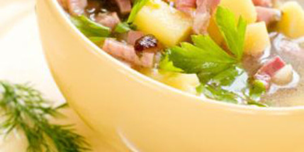 Pievieno galu, pielej buljonu un uzvāra. Pieber sāli, piparus, ķimenes un majorānu. Zupai pievieno puravu un kartupeļus un uz vidējās uguns vara apm. 20 min, kamēr kartupeļi ir mīksti.