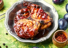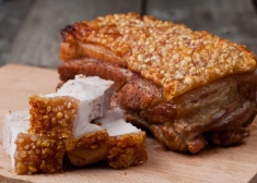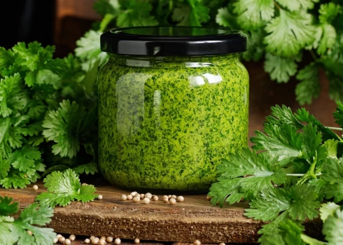 Lēni cepta cūkas pavēdere ar zaļumu mērcīti