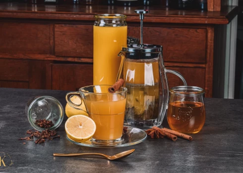 Karstais zaļās tējas, medus un apelsīnu sulas kokteilis
