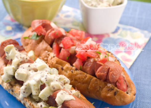 Hotdogs ar spirāldesiņām un salātiem
