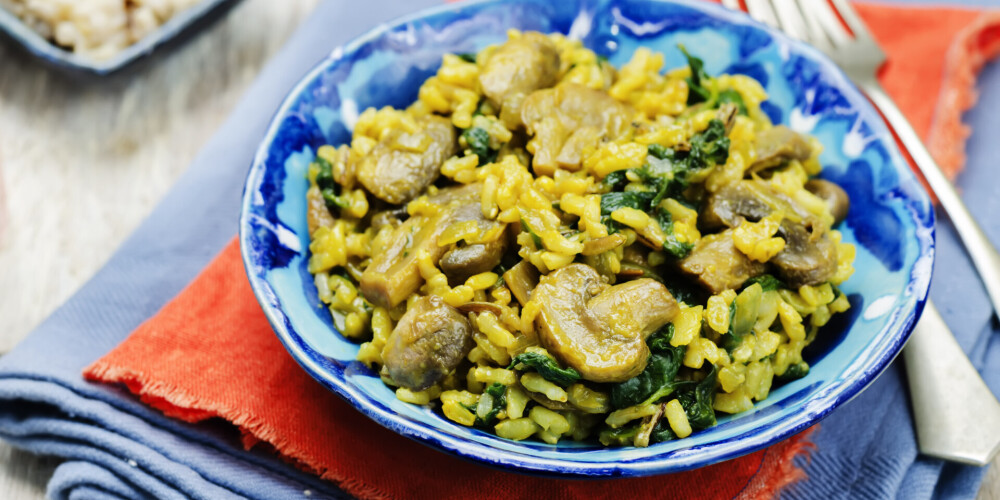 Pievieno rīsus, buljonu un citrona sulu. Samaisi, uzliec vāku un turpini vārīt 15 minūtes, līdz rīsi sasūkuši visu šķidrumu.