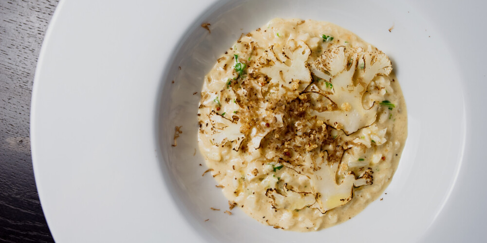 Liec klāt ziedkāpostus un ik pa brīdim turpini 10 minūtes gatavot, līdz ziedkāposts ir mīksts. Pievieno sieru. Pārber ar rozmarīnu un ciedru riekstiem.