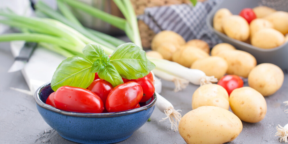 Kartupeļus pārgriez uz pusēm, lielākos – četrās daļās un ieber salātu bļodā.