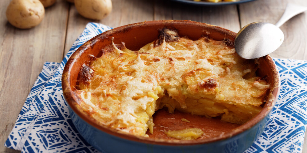 Karstumizturīgu formu izklāt ar cepamo papīru un iesmērēt ar sviestu. Kartupeļu šķēles ņem ārā no saldā krējuma un kārto slāņiem formā. Atlikušo saldo krējumu saputo ar olu un pārlej pāri kartupeļiem.