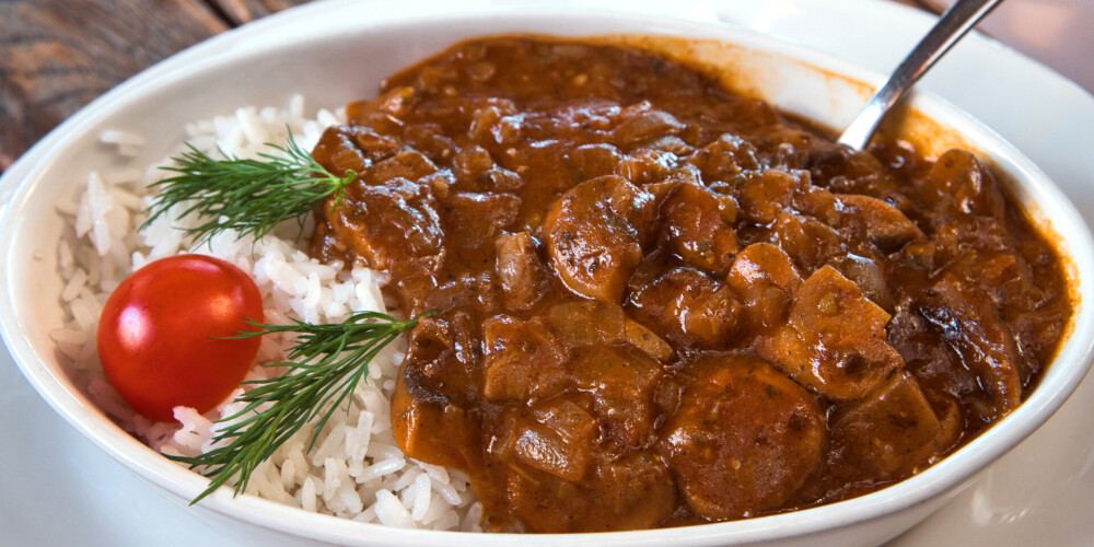 Pievieno apcepto gaļu, rīsus un tomātu pastu, iemaisi malto papriku. Pielej aptuveni 800 ml ūdens, pieber sāli un piparus un sautē 40 minūtes.