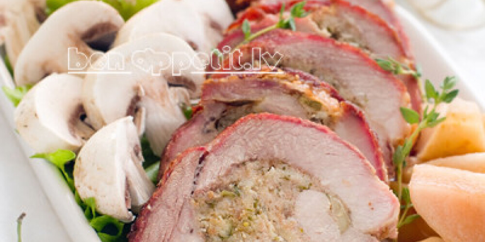 Pannā uzkarsēt eļļu un apcept tajā smalki sakapātus sīpolus un ķiplokus. Pievienot sagrieztas sēnes, rīvmaizi, sāli pēc garšas un apcept visu kopā. Pievienot pētersīļus, samaisīt. Masu uzlikt uz izklapētas gaļas, satīt ruletē, sasiet ar kulināro degu.