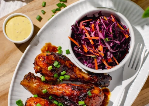 Vistu kājiņas medus un sojas marinādē ar sarkano kāpostu salātiem