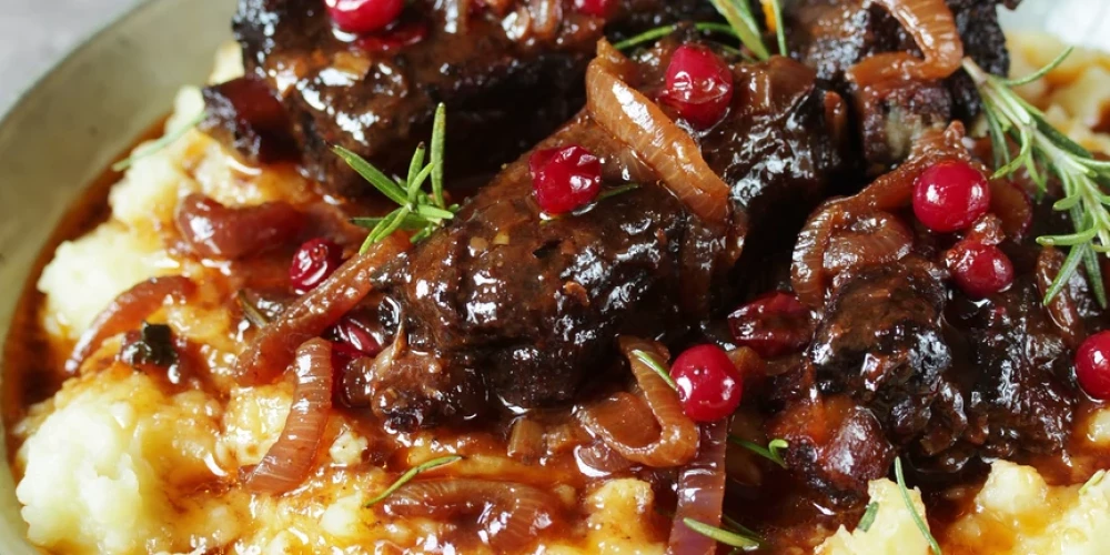 Tefteļi tomātu mērcē ar kartupeļu biezeni un marinētām bietēm
