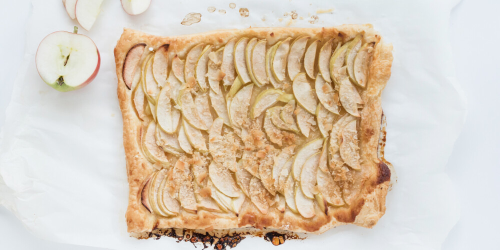 Mīklu izrullē un klāj uz cepamās plāts. Uz tās izkārto ābolus. Ļauj plātsmaizei rūgt vēl pusstundu.