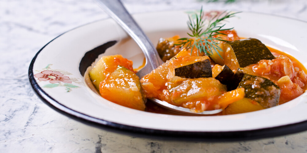 Pievieno šķēlēs sagrieztus tomātus, uzkarsē un uz vidējas uguns, ik pa laikam apmaisot, sautē aptuveni 30 minūtes.
