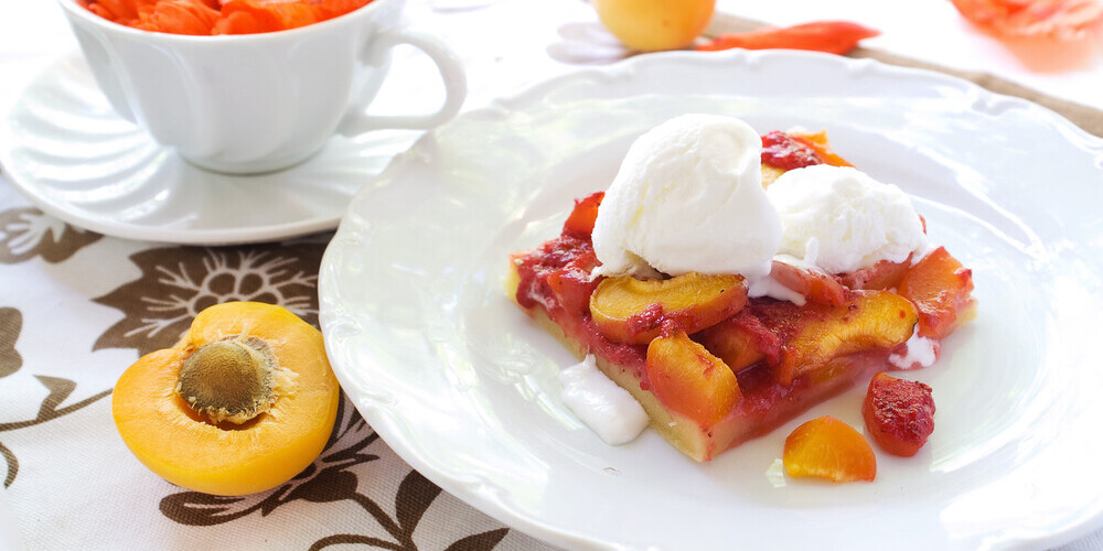 Mīklu izņemt no ledusskapja un izrullēt uz pārkaisīta ar miltiem dēlīša. Jau izrullētu mīklu ieklāt formā. Sakārtot sagrieztas aprikozes un pa virsu pārliet ar zemeņu mērci. Pārkaisīt ar ar 1 ēd.k.cukuru. Cept iepriekš sakarsētā cepeškrāsnī 180 grādos apmēram 30min. Pasniegt vēl siltu ar saldējumu.
