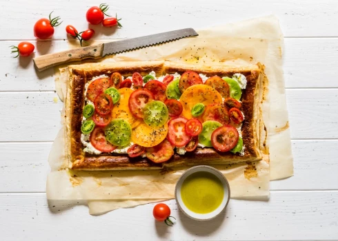Siera un tomātu pīrāgs no kārtainās mīklas