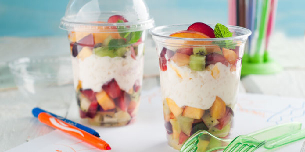 Plastikāta konteinerā kārto augļus, tad rīsus un pa virsu vēlreiz augļus.