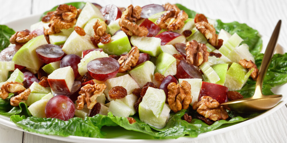 Vīnogas, riekstus, čili un ķiplokus ber bļodā, aplej ar mērci un izcilā.