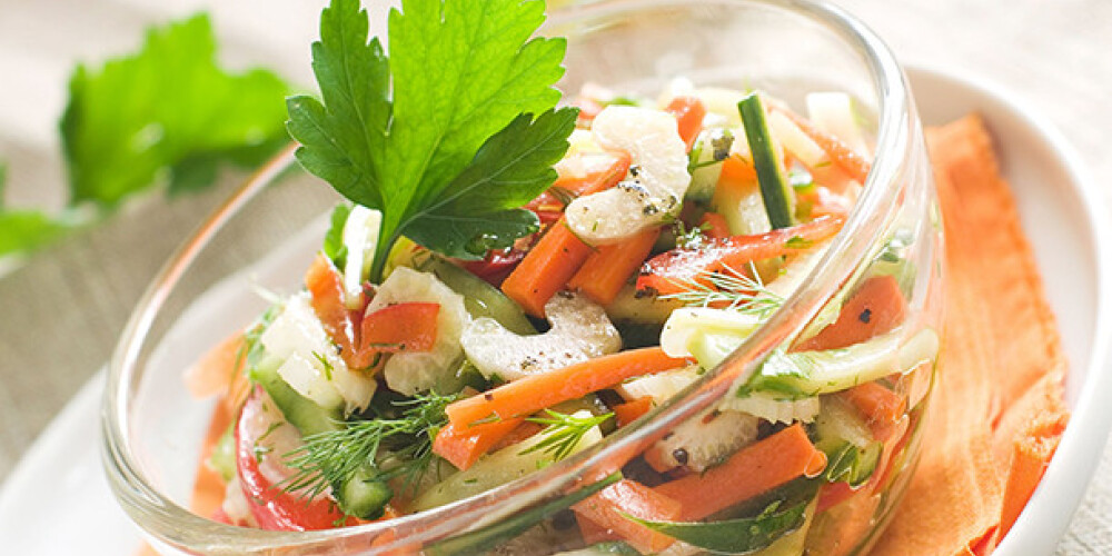 Seleriju, burkānus, cukini, piparus un kapātos pētersīļus kārto lielā salātu bļodā.