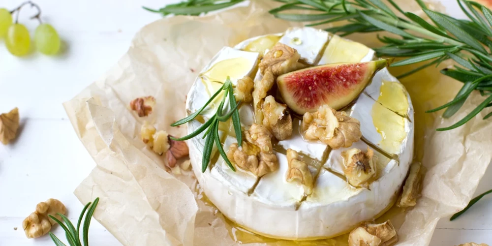 Krāsnī cepts kamambērs ar augļiem un riekstiem