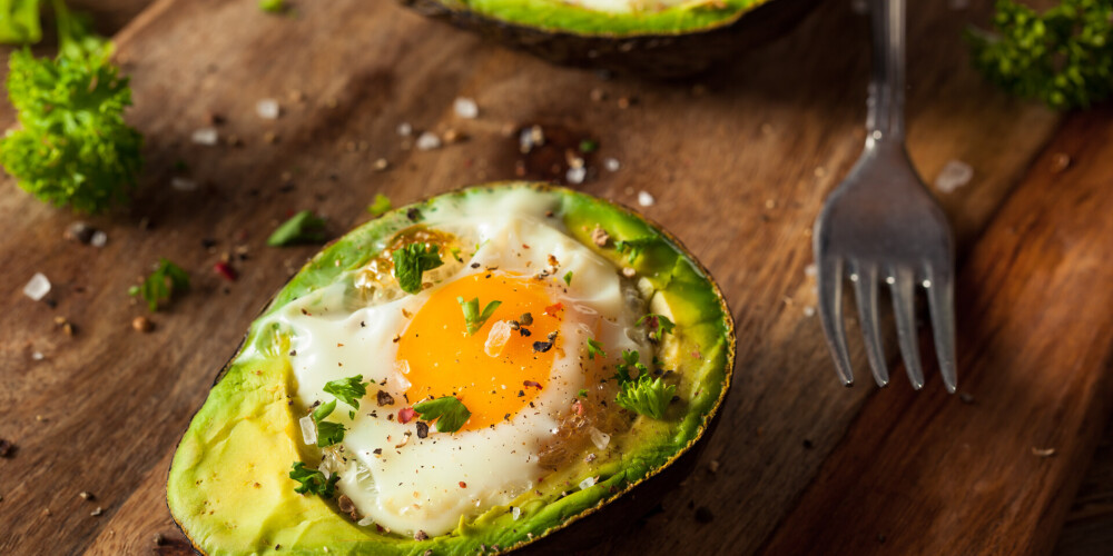 Cepeškrāsni sakarsē līdz 200 grādiem. Avokado apzied ar eļļu, akurāti pārgriez uz pusēm un izņem kauliņu (miza paliek!). ar spicu karoti izņem daļu mīkstuma, lai ir vieta, kur iepildīt olu.