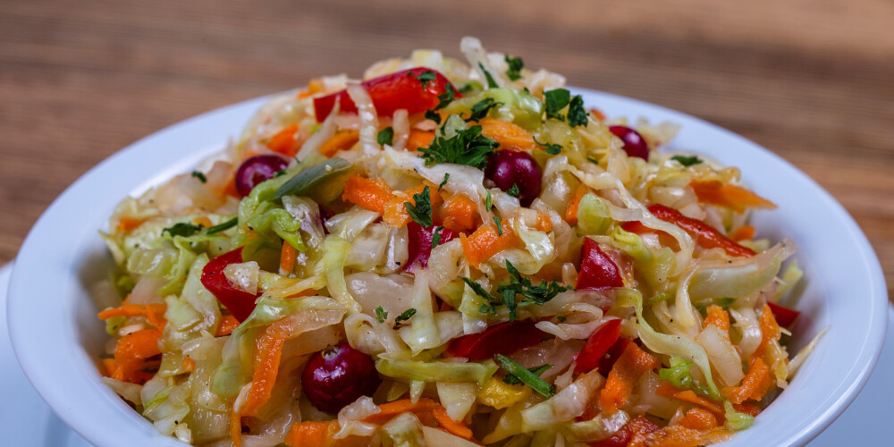 Bļodā samaisi saēvelētus kāpostus, rupjās skaidiņās sarīvētus burkānus, strēmelēs sagrieztas paprikas pākstis bez sēklām, salmiņos sagrieztu selerijas sakni un sakapātus zaļumus.