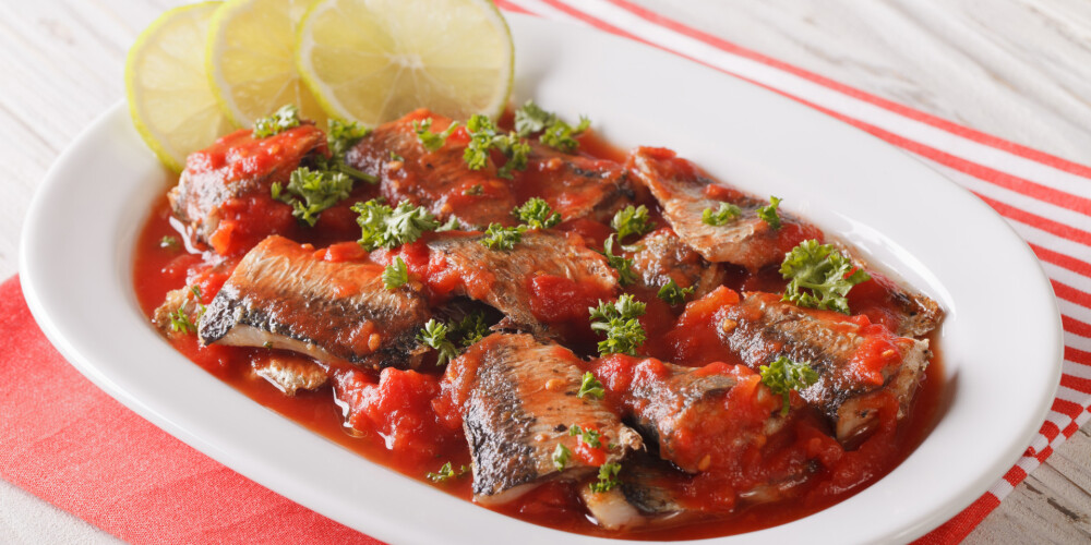 Pievieno tomātu mērci un sautē uz lēnas uguns vēl 30–40 minūtes, ik pa brīdim pagaršojot. Kad burkāni kļūst mīksti un marināde iegūst labu garšu, dārzeņus noņem no uguns un tos pārklāj zivij, to pilnībā nosedzot.