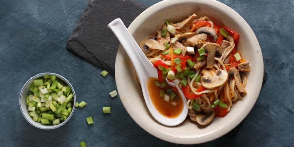 500ml ūdens sajaukt ar Tom Yum pastu un uzkarsēt vok-pannā. Pievienot papriku un burkānus un vārīt 5 min. Pievienot sēnes, nūdeles, gaļu un vārīt vēl 5 min. Pievienot zivju mērci un laima sulu.